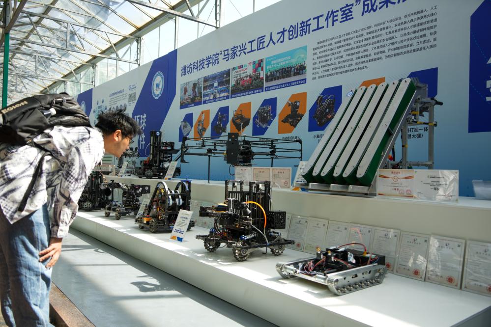 20日、中国(寿光)国際野菜科学技術博覧会で農業用ロボットを見学する来場者。(濰坊=新華社記者/徐速絵)