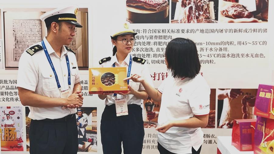 7日、展示会場で輸出商品を確認する黄埔税関の職員。(広州=新華社配信)
