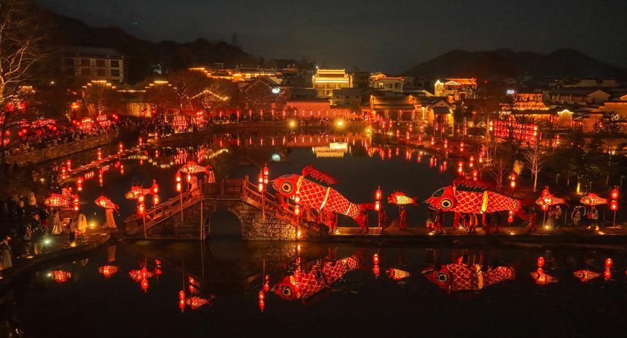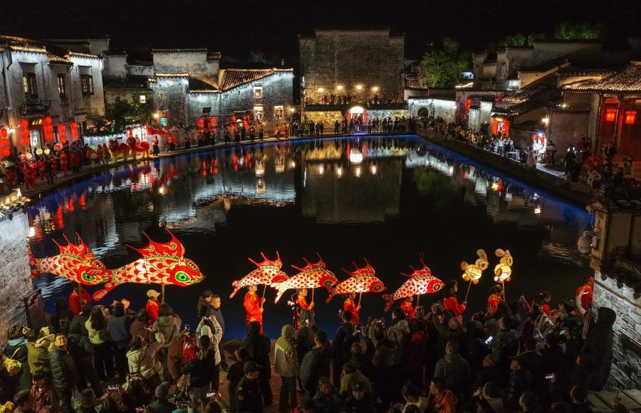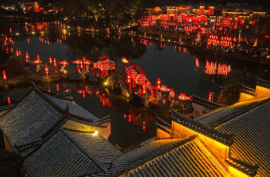 黄山市徽州区の呈坎(ていかん)古村で行われた魚灯のパレード。(1月20日、ドローンから、黄山=新華社配信/施亜磊)