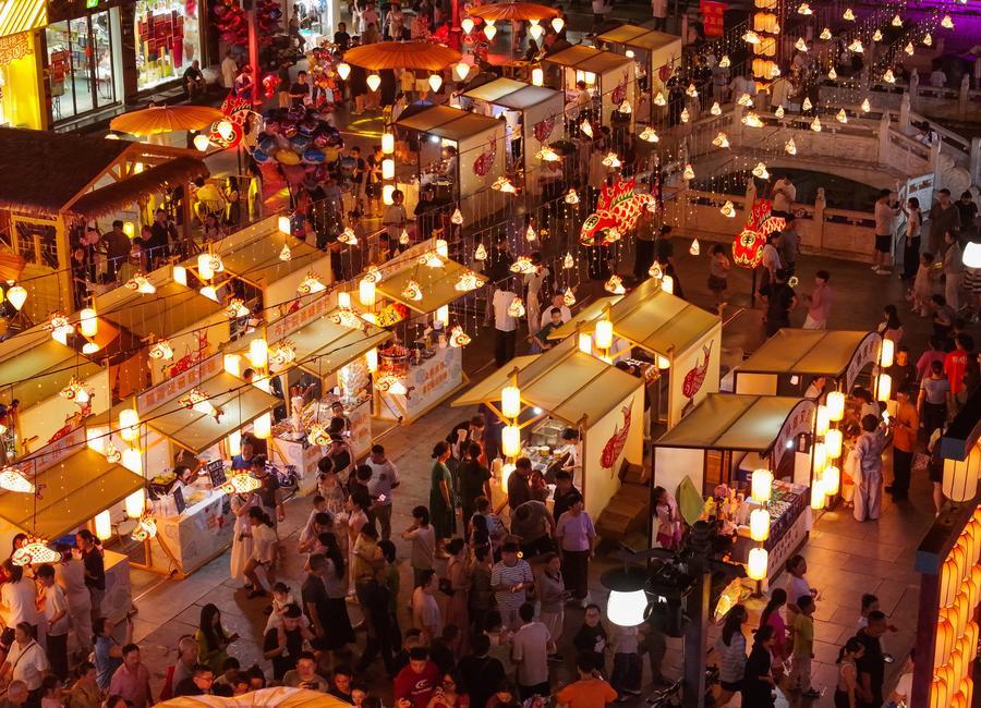 黄山市歙(きゅう)県の徽州古城で開催されたマーケット。(2025年10月2日、ドローンから、黄山=新華社配信/施亜磊)