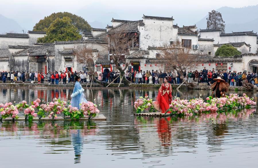 黄山市黟県の宏村で披露されたパフォーマンス。(2月20日撮影、黄山=新華社配信/施亜磊)