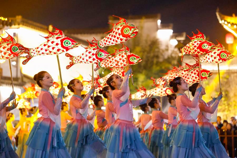 【新華社合肥4月25日】中国安徽省黄山市黟(い)県の秀里古村では夜になると、魚の形をしたランタン「魚灯」のパレードがにぎやかに行われ、色とりどりの明かりが伝統行事と村の夜景を引き立てる。訪れた観光客は時間をさかのぼったような感覚に包まれながら、奥深い地域文化を体験する。