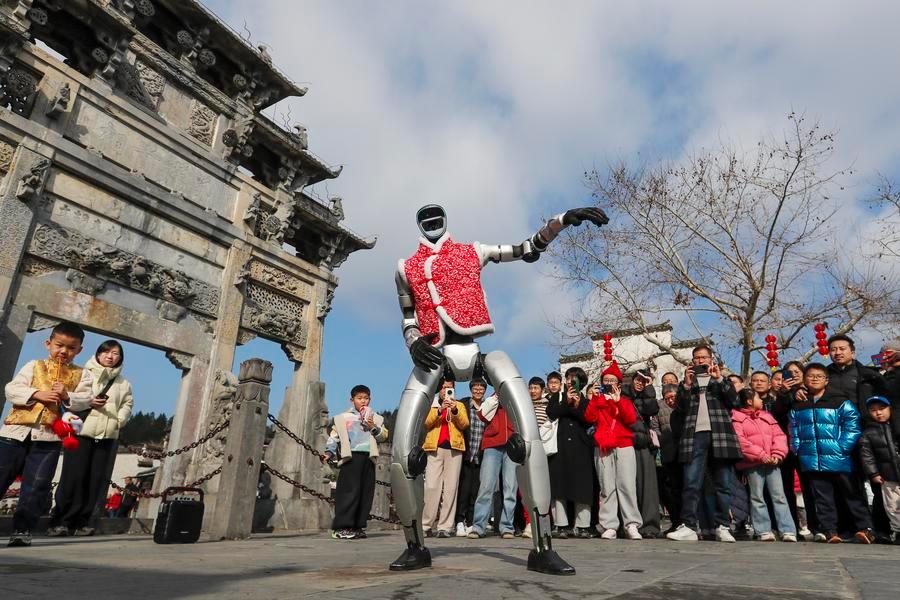 黄山市黟県の西逓古村で双方向型のパフォーマンスを披露するロボット。(2月18日撮影、黄山=新華社配信/施亜磊)