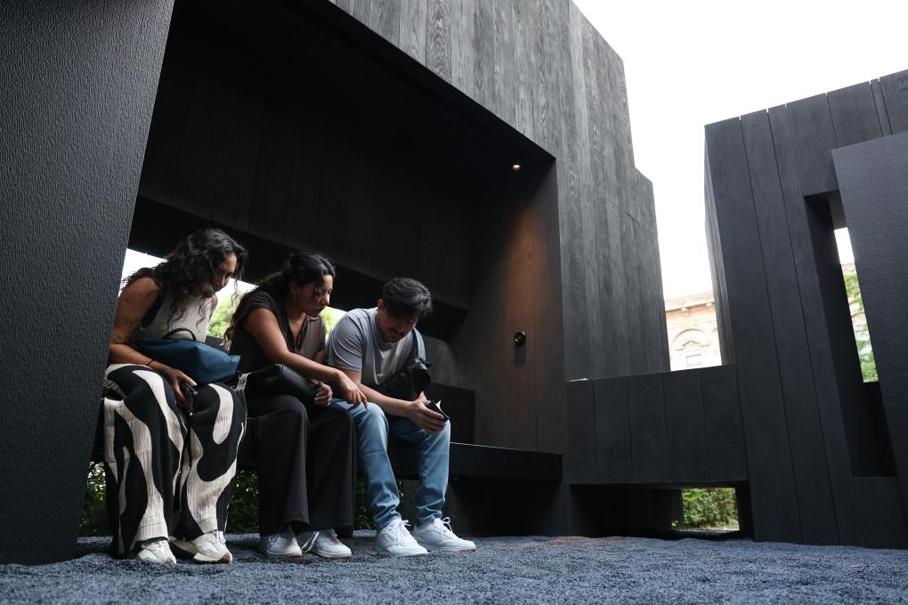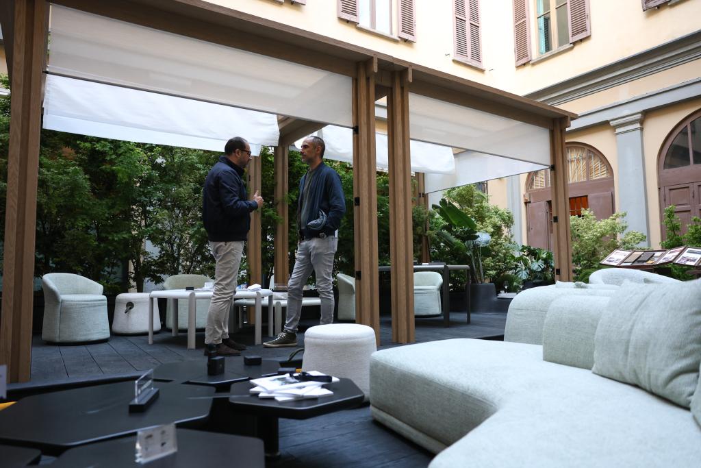 22日、ミラノのブレラ地区で、中国ブランド「院半」と香港地区の建築家でデザイナーの梁志天(りょう・してん)氏が共同で発表したアウトドアリビング「山水之境」を見学する出展者。(ミラノ=新華社記者/李京)