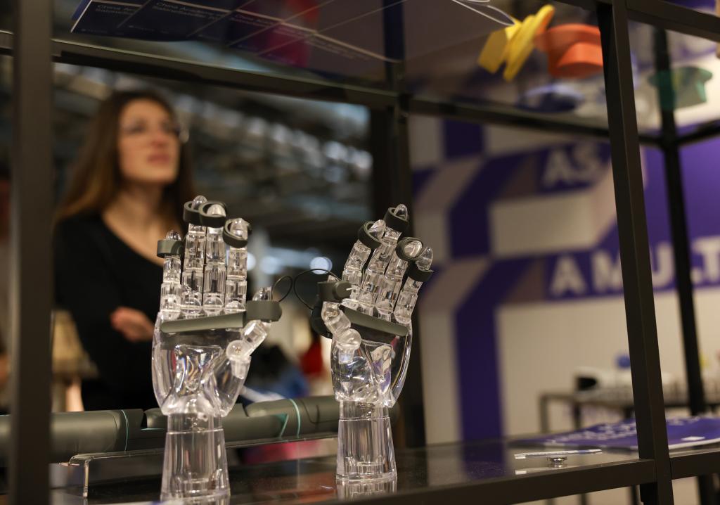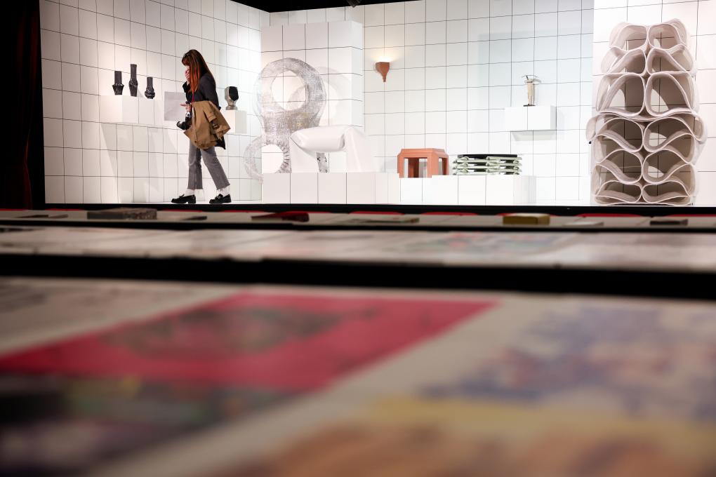 22日、ミラノ郊外にある国際見本市会場ロー・フィエラミラノで、ミラノサローネ国際家具見本市に出展した同済大学(上海市)のブースに展示された3Dプリント作品。(ミラノ=新華社記者/李京)