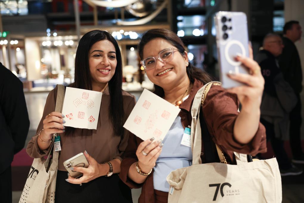 22日、ミラノ郊外にある国際見本市会場ロー・フィエラミラノで、ミラノサローネ国際家具見本市に出展した中国国家級無形文化遺産の「魯庵印泥(朱肉)」を使って自らデザイン、制作した作品と記念撮影する来場者。(ミラノ=新華社記者/李京)