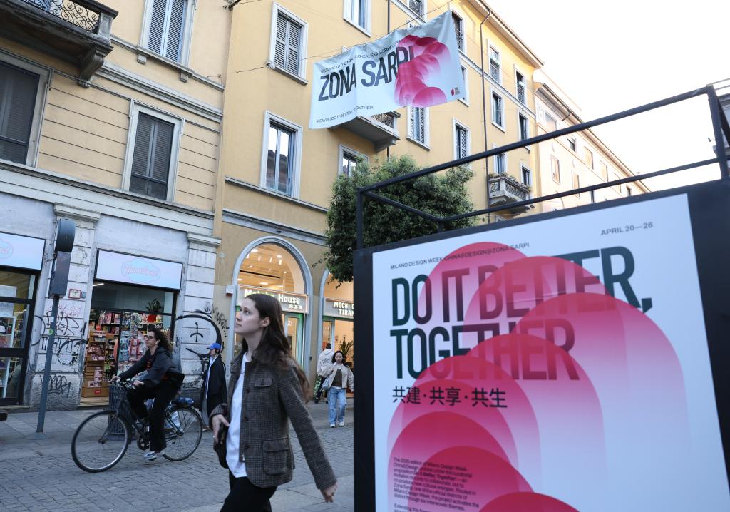 22日、ミラノのチャイナタウン「パオロ・サルピ通り」で、「中国デザインウイーク」のポスターの前を通る人々。同ウィークはミラノデザインウイークの一環で開催される。(ミラノ=新華社記者/李京)