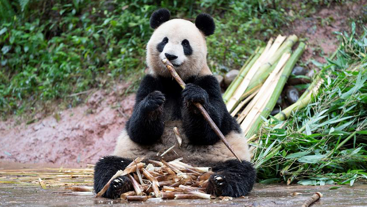 パンダのシンシン、皮をむいてタケノコぱくり 中国四川省