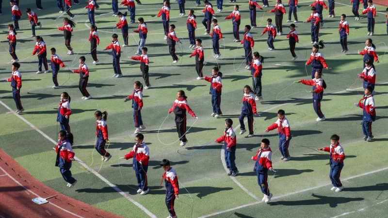 小学生が縄跳び体操、リズム感や柔軟性向上 中国福建省武夷山