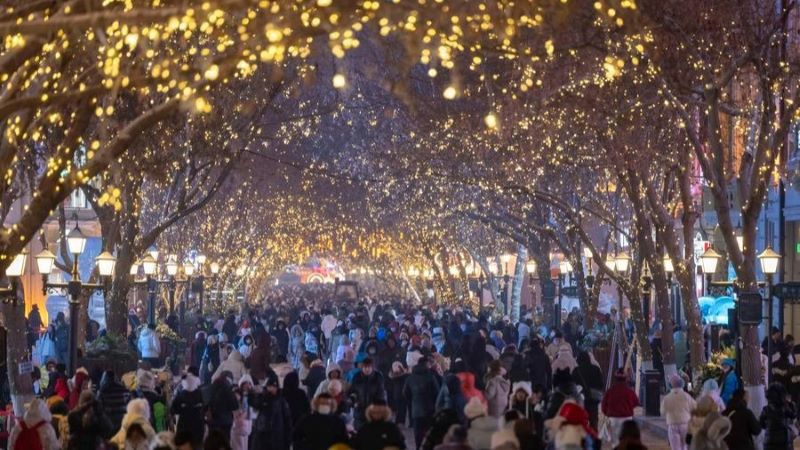 氷雪観光シーズン迎えにぎわう夜の中央大街 中国・ハルビン市