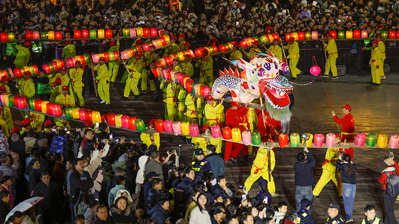 古城を彩る元宵節の板凳竜 中国・安徽省休寧県