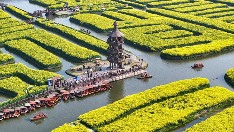 水面に浮かぶ菜の花畑が観光客を魅了 中国・江蘇省興化市