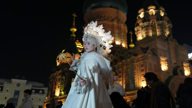 ドレス姿で写真撮影を楽しむ観光客 中国・ハルビン市