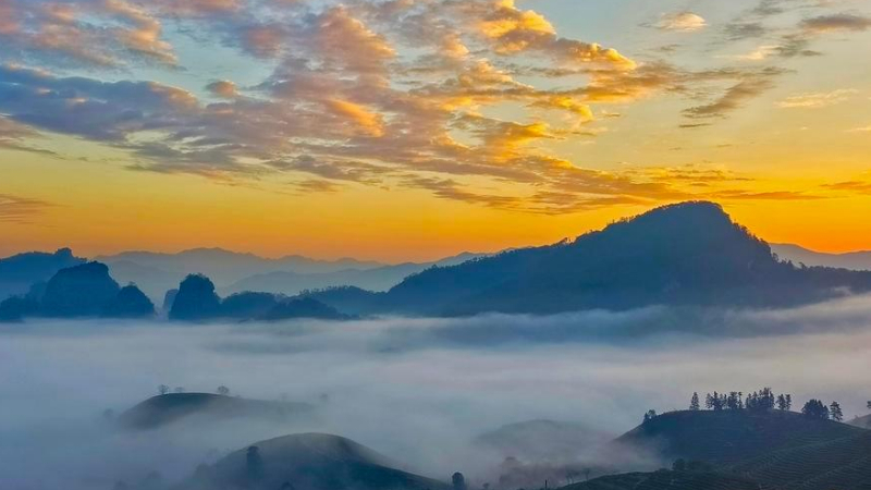 中国雲南・無量山で冬桜咲く 茶園と雲海に彩られる山あい
