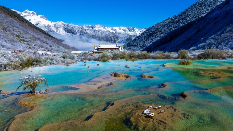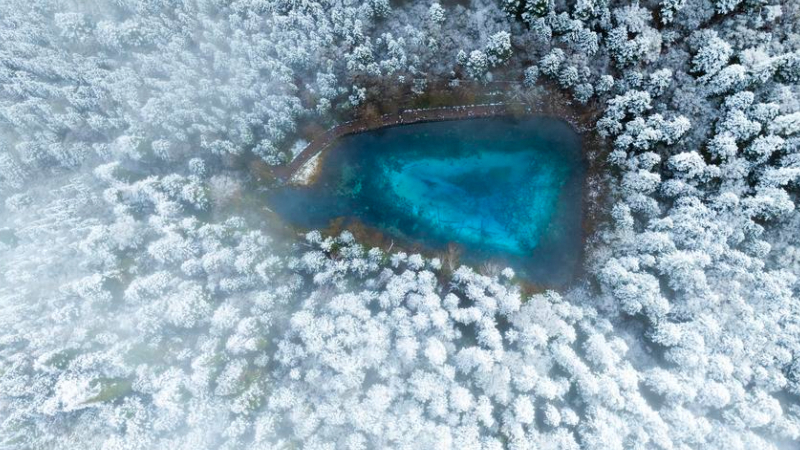 世界遺産・九寨溝が一面の銀世界に 中国四川省