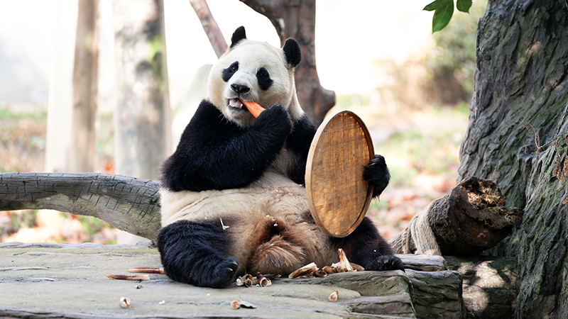 パンダの福宝、ニンジンをがぶり 中国四川省