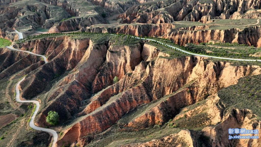 10日、麻黄梁黄土地質公園を貫く観光道路。(小型無人機から、楡林=新華社記者/陶明)