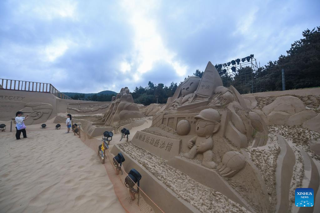 6月28日、朱家尖南沙景区で展示されているスポーツを題材にした砂像。(舟山=新華社記者/徐昱)pagebreak