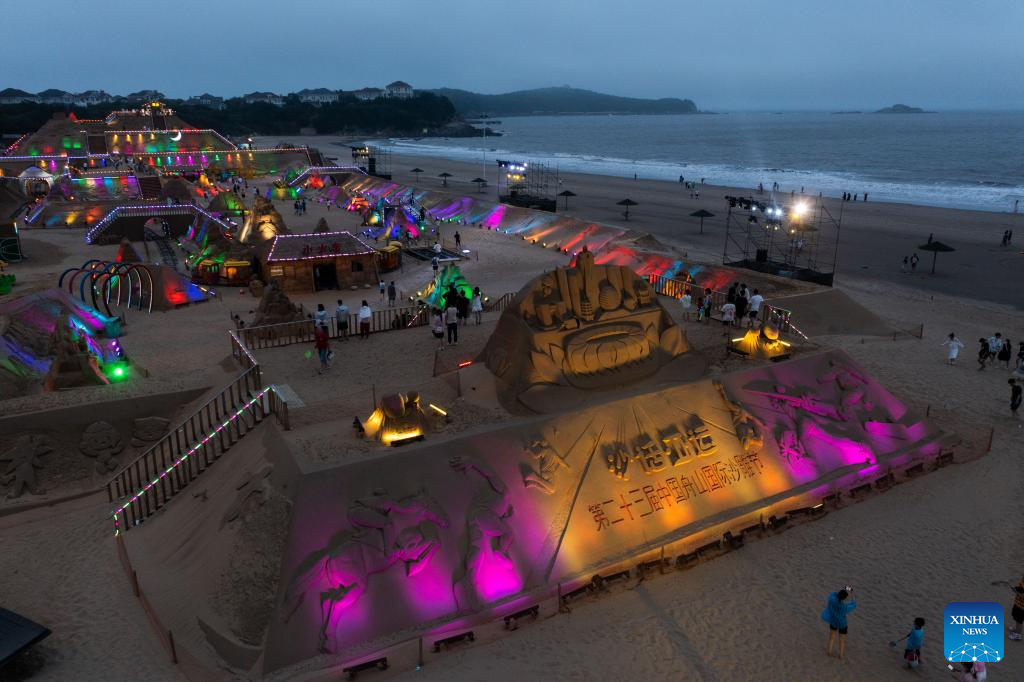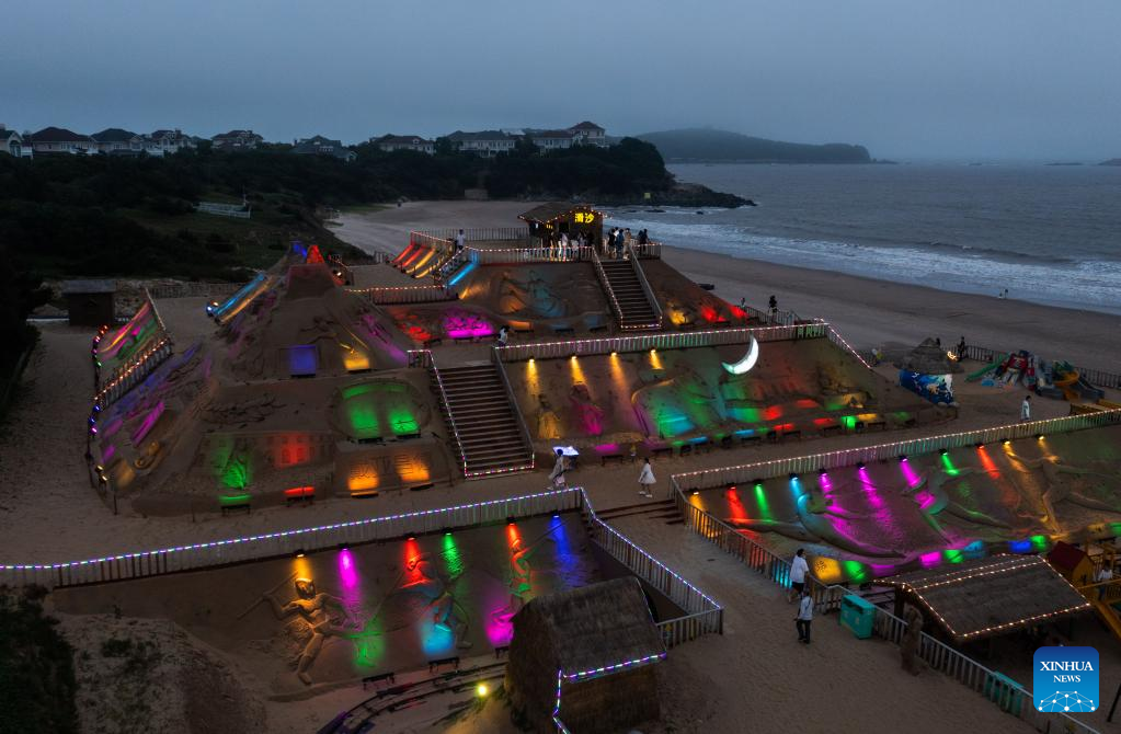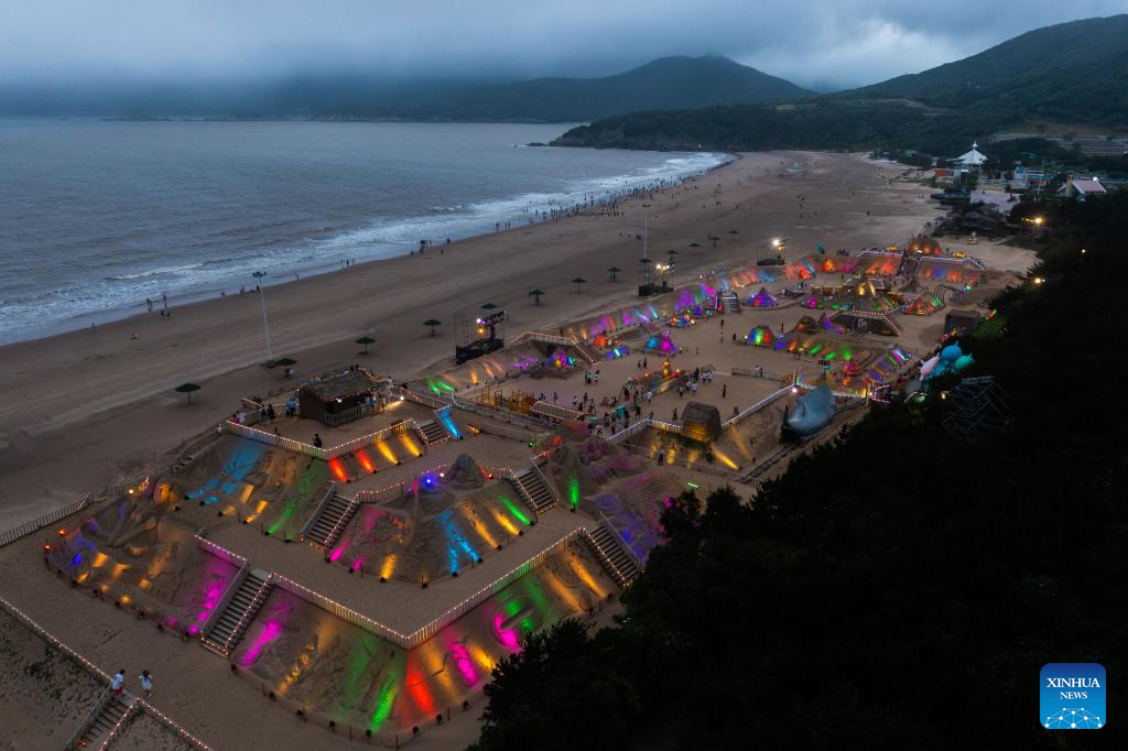 6月28日、ライトアップされた砂像展示エリア。(小型無人機から、舟山=新華社記者/徐昱)
