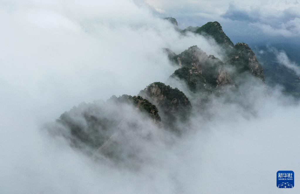 4日、雲海に包まれる、北京市密雲区と河北省承徳市灤平県の境界付近にある万里の長城。(小型無人機から、北京=新華社記者/陳曄華)