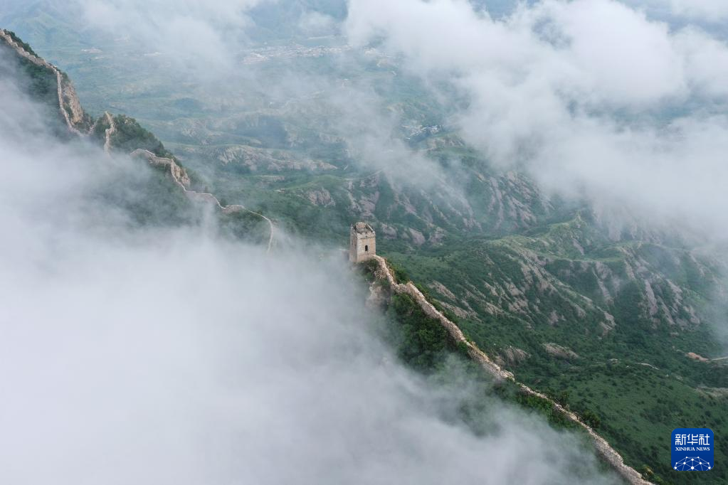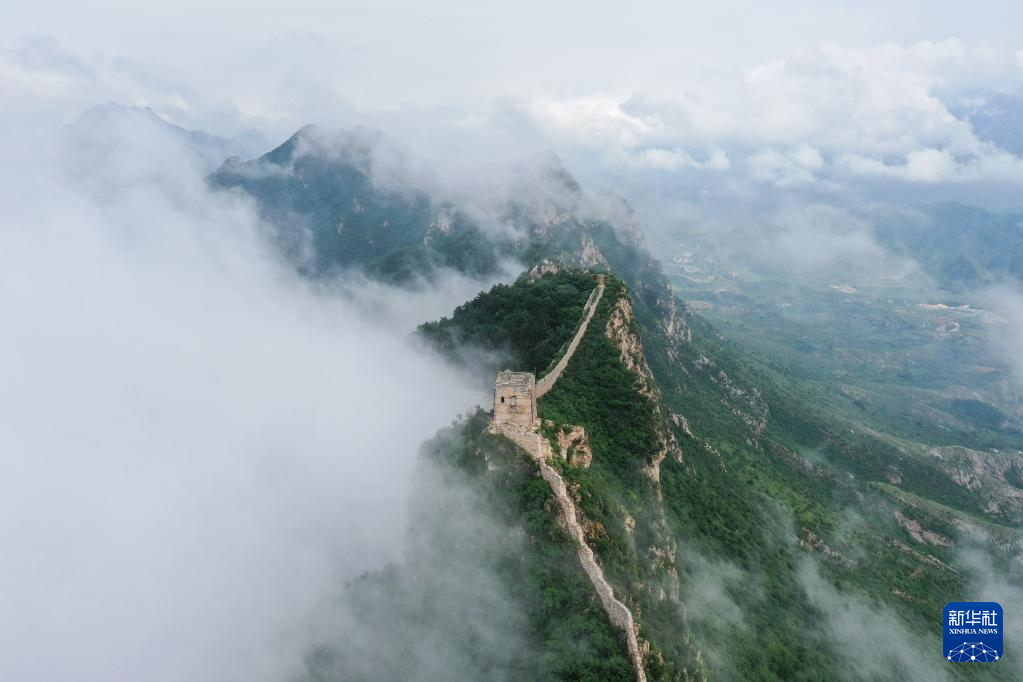 【新華社北京7月5日】中国北京市密雲区と河北省承徳市灤平県の境界付近にある万里の長城で4日、雨上がりに雲海が現れ、水墨画のような風景が広がった。pagebreak