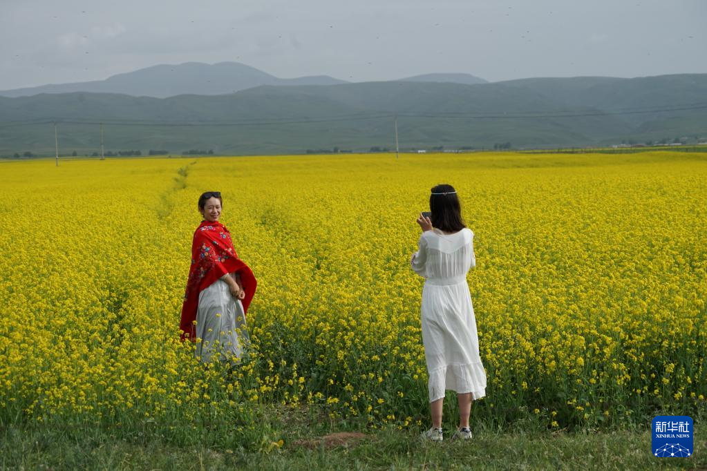 9日、青海湖畔に広がる菜の花畑で記念撮影する観光客。(西寧=新華社記者/王大千)