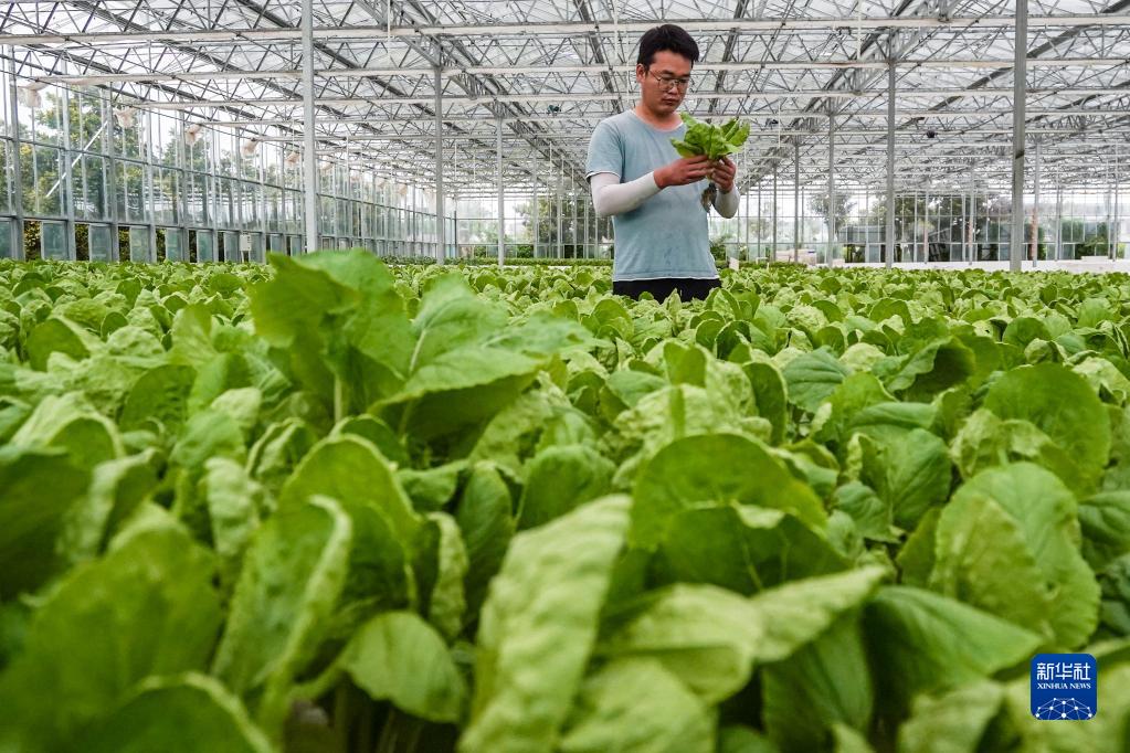 海門現代農業産業モデルパークの野菜水耕栽培基地で、野菜の生育状況を確認する農業技術者。(7月26日撮影、南通=新華社記者/李博)