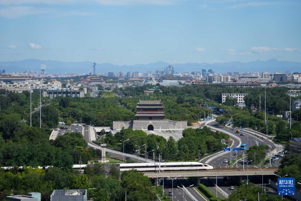 16日、北京市の永定門城楼前を走行する列車。(北京=新華社記者/鞠煥宗)pagebreak