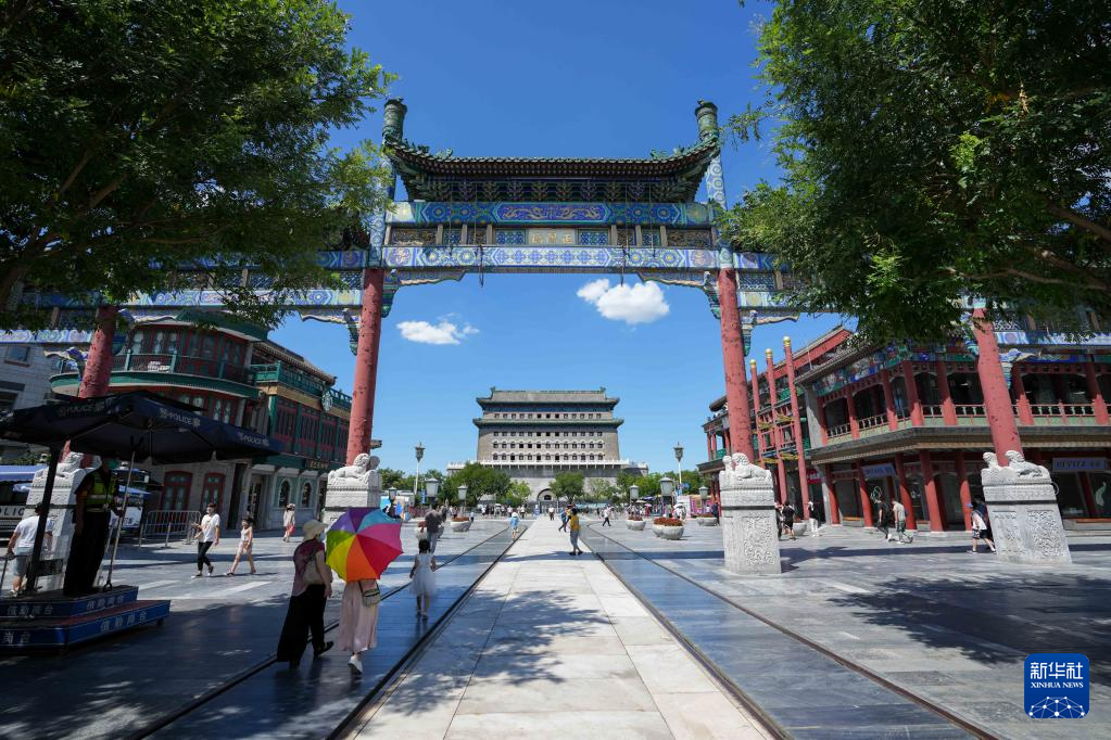 16日、北京市の前門大街を散策する観光客。(北京=新華社記者/鞠煥宗)