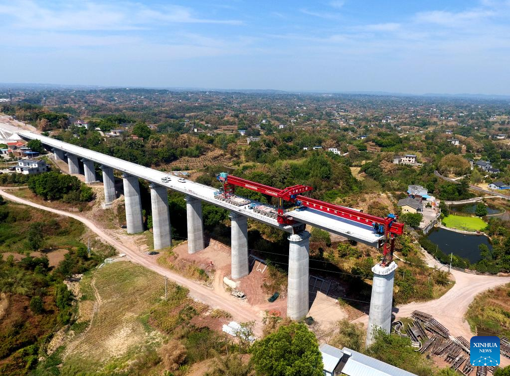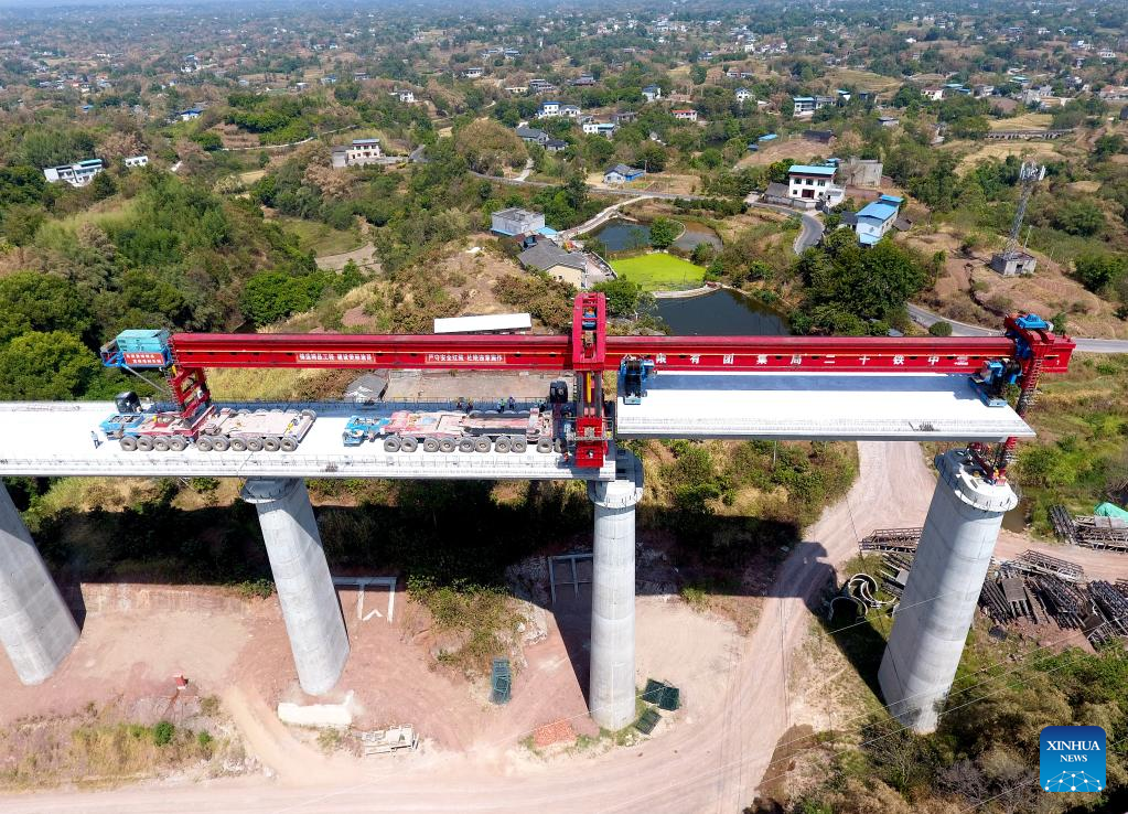23日、渝昆高速鉄道の四川省-重慶市区間にある陳家嘴特大橋の建設現場。(小型無人機から、瀘州=新華社配信/胡志強)