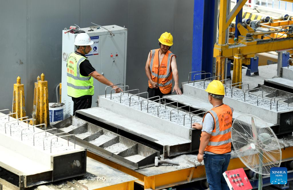 23日、渝昆高速鉄道の四川省-重慶市区間に設けられた竜馬潭橋梁製作場で、完成した橋梁体を検査する職員。(瀘州=新華社配信/胡志強)