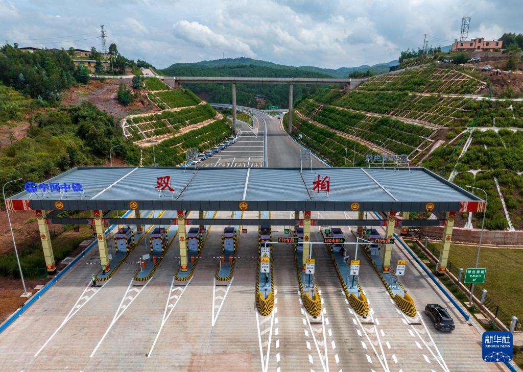 26日、楚雄イ族自治州双柏県の料金所から玉楚高速道路に入る車両。(小型無人機から、楚雄=新華社記者/江文耀)pagebreak