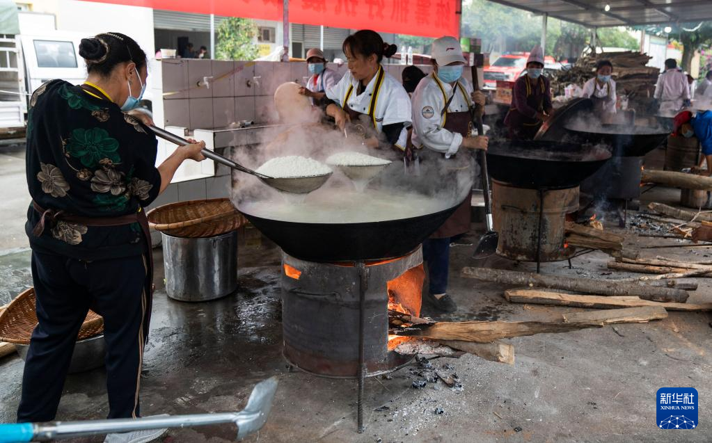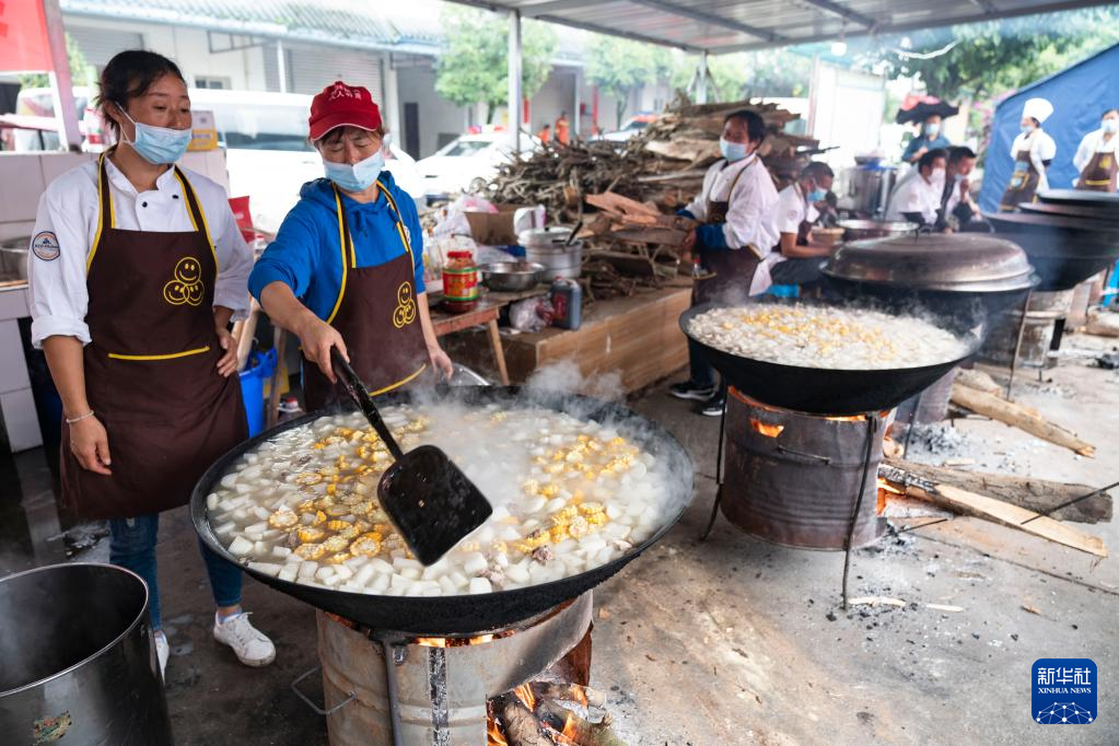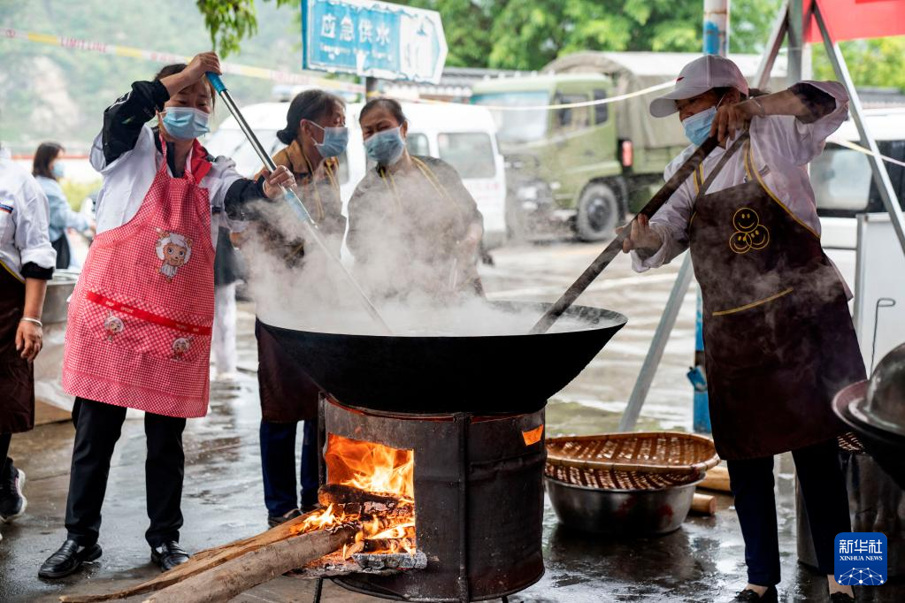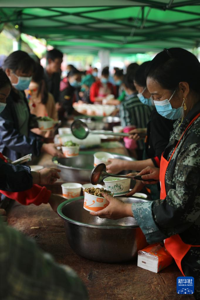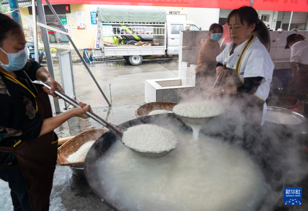 9日、石棉県新民郷海耳村に設けられた臨時避難所で、食事を用意するボランティア。(雅安=新華社記者/才揚)