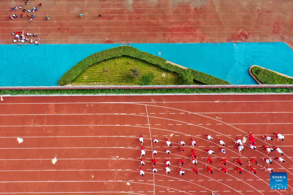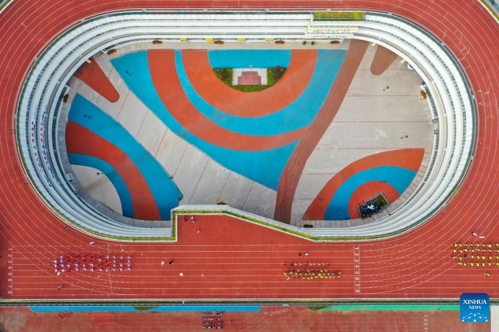 20日、校舎屋上にある運動場で体育の授業を受ける斉河県第六小学校の児童ら。(小型無人機から、徳州=新華社記者/朱崢)pagebreak
