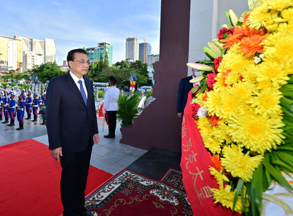 9日、シアヌーク太皇(前国王)の彫像に花輪を献上する李克強氏。
