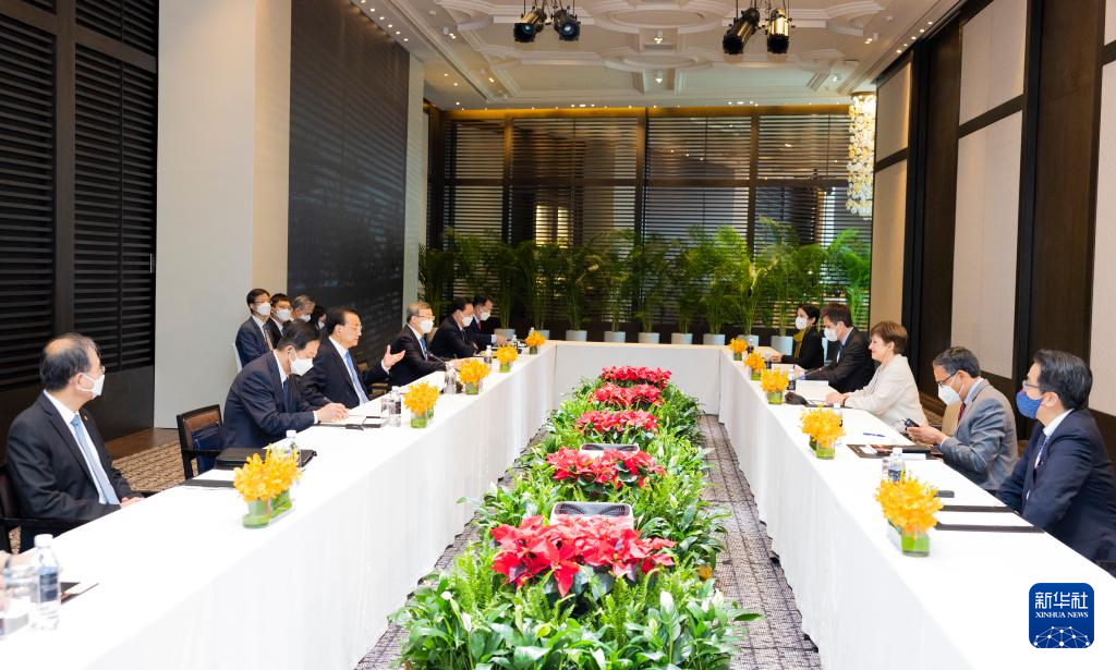 中国の李克強(り・こくきょう)国務院総理は12日午後、カンボジアの首都プノンペンで、一連の東アジア協力首脳会議に出席する国際通貨基金(IMF)のゲオルギエバ専務理事と会見した。(プノンペン=新華社記者/黄敬文)