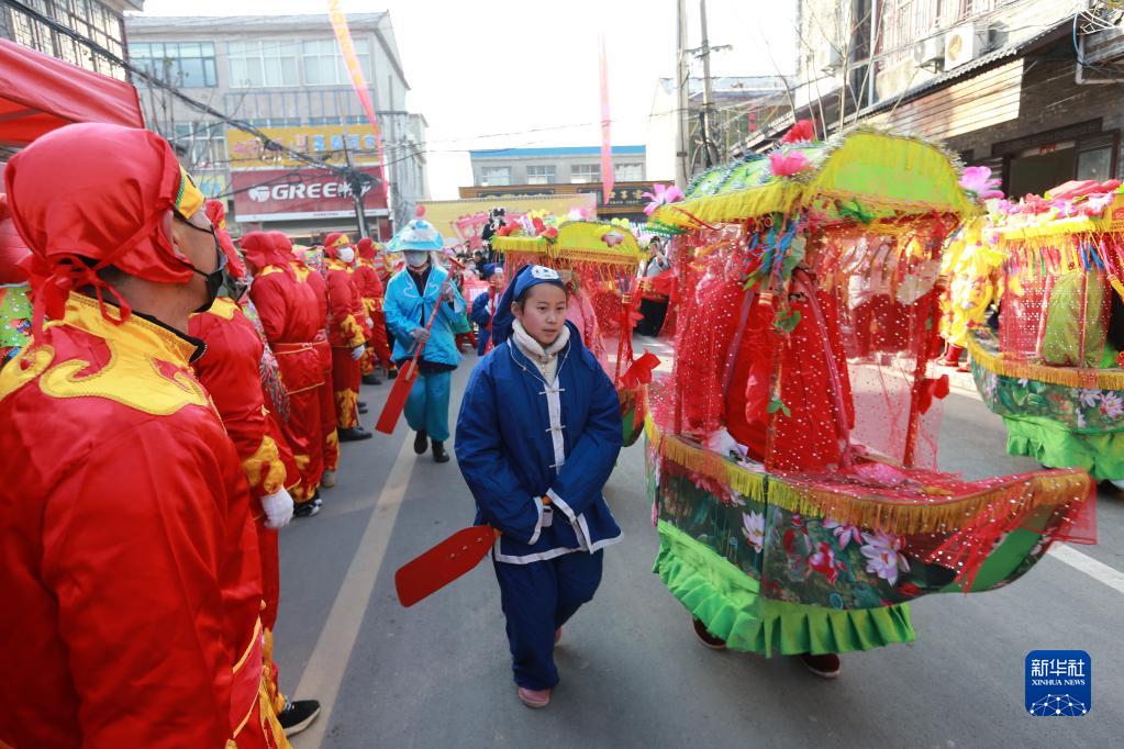 17日、濉渓(すいけい)県臨渙鎮で行われる伝統民俗芸能「独杆轎」。(淮北=新華社配信/万善朝)pagebreak