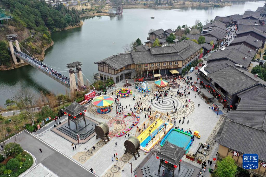 25日、貴州省丹寨県の万達小鎮景区で、新春縁日を楽しむ人たち。(小型無人機から、貴陽=新華社配信/肖偉)pagebreak