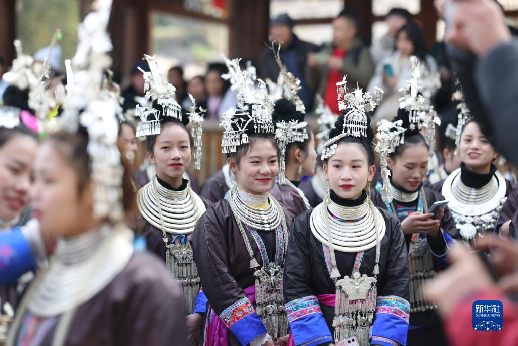 25日、貴州省黔東南ミャオ族トン族自治州従江県の頂洞村で、民族衣装に身を包みイベントに参加するトン族の女性。(貴陽=新華社配信/粟勇主)