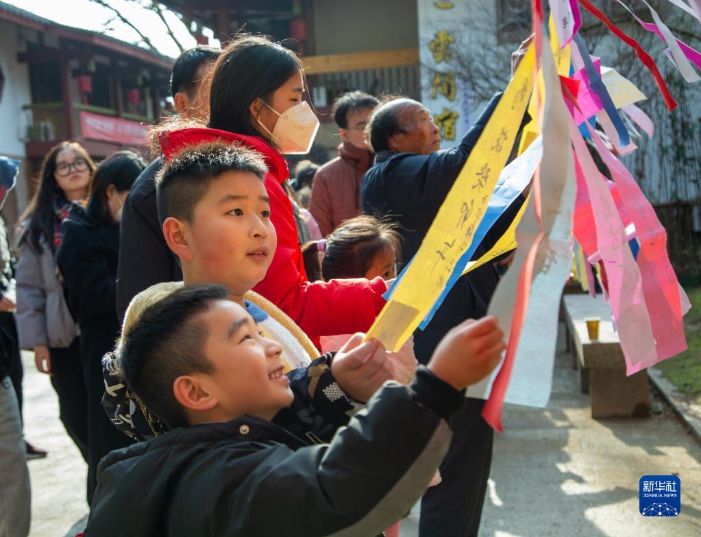 24日、福建省武夷山市の武夷宮歩行街(歩行者専用道)で「猜灯謎(さいとうめい、なぞなぞ遊び)」を楽しむ子ども。(武夷山=新華社配信/陳穎)pagebreak