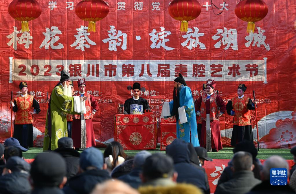 25日、寧夏回族自治区銀川市賀蘭県の潤園文化広場で披露された秦腔(しんこう)劇「烙碗記」。(銀川=新華社記者/王鵬)pagebreak