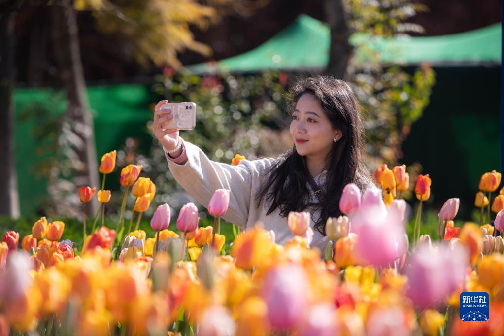 25日、雲南省昆明市で開かれたチューリップ展で自撮りする人。(昆明=新華社記者/胡超)pagebreak