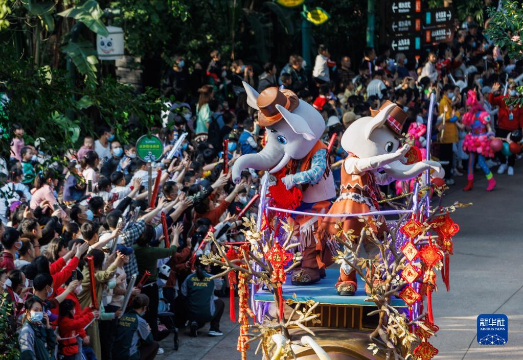 22日、広東省広州市の長隆野生動物世界で、新年の花車パレードを楽しむ人たち。(広州=新華社記者/劉大偉)pagebreak