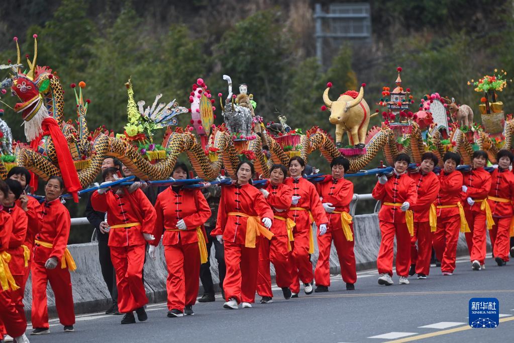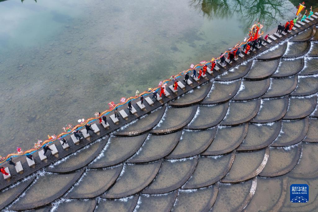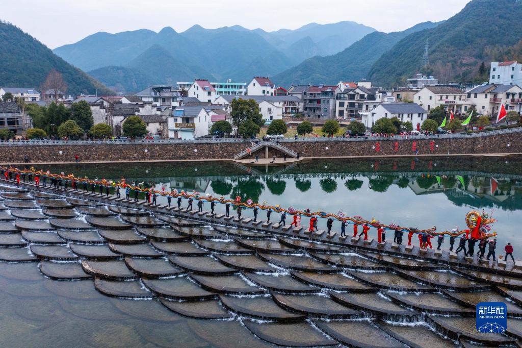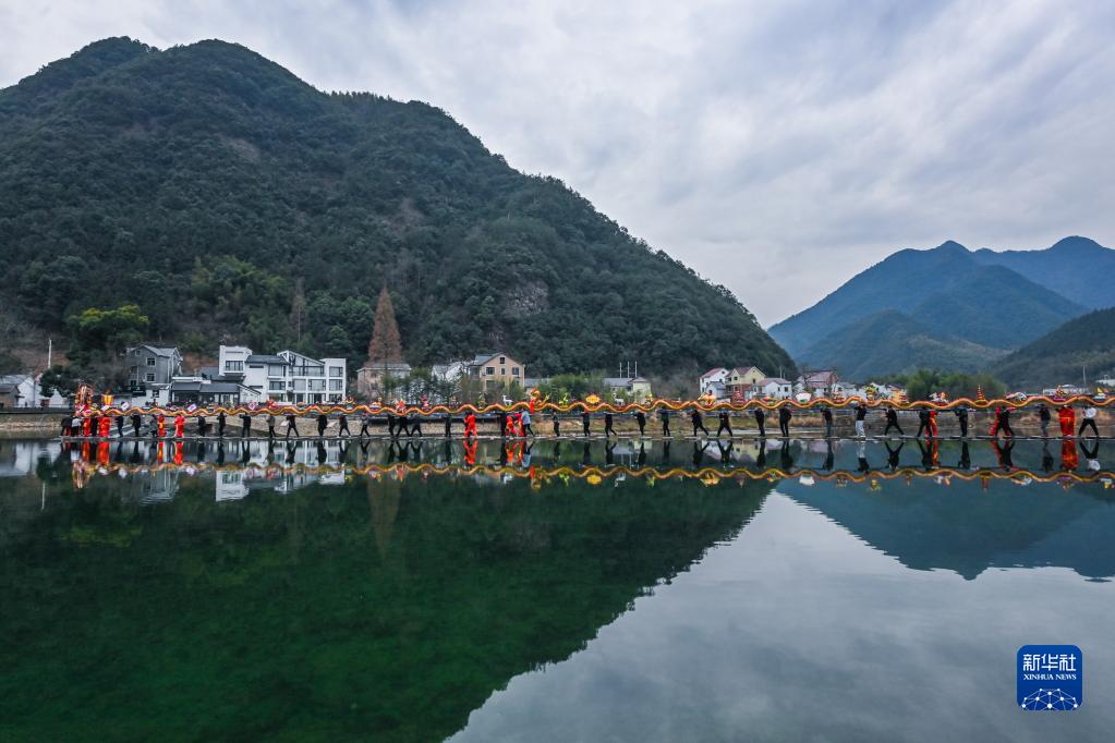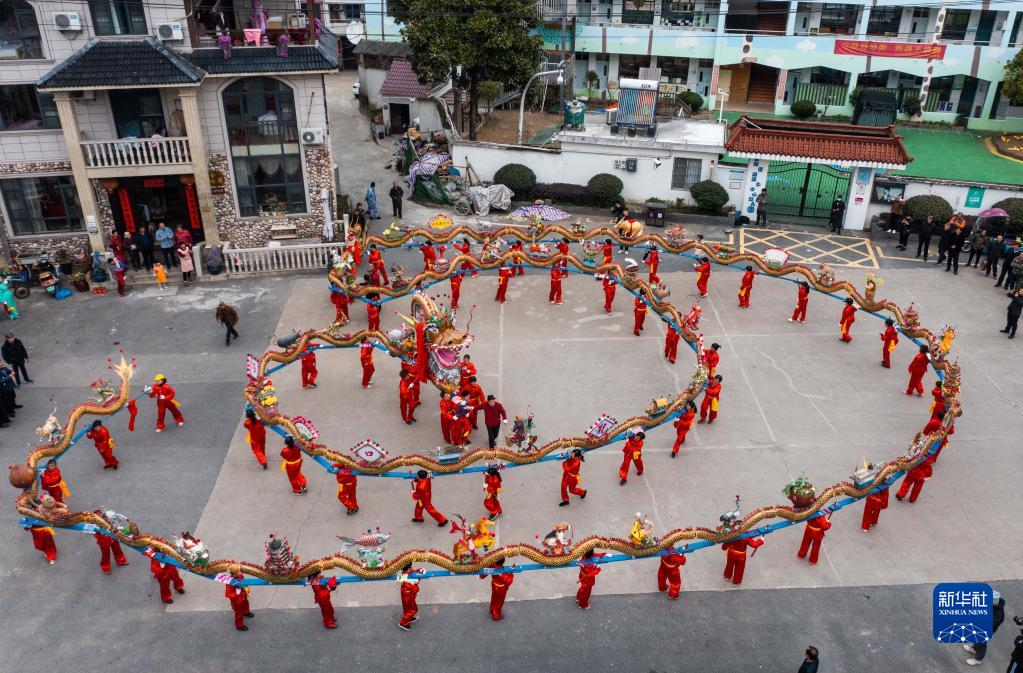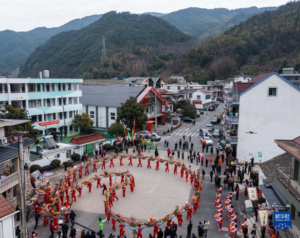 【新華社杭州2月4日】中国浙江省杭州市富陽区湖源郷で1日、旧暦1月15日の元宵節(今年は2月5日)を前に「板竜」の舞いが披露された。同郷窈口(ようこう)村の女性が木製の腰掛け50脚余りをつないで作った長さ100メートルの板竜を掲げ、銅鑼や太鼓のリズムに合わせて舞いを披露した。