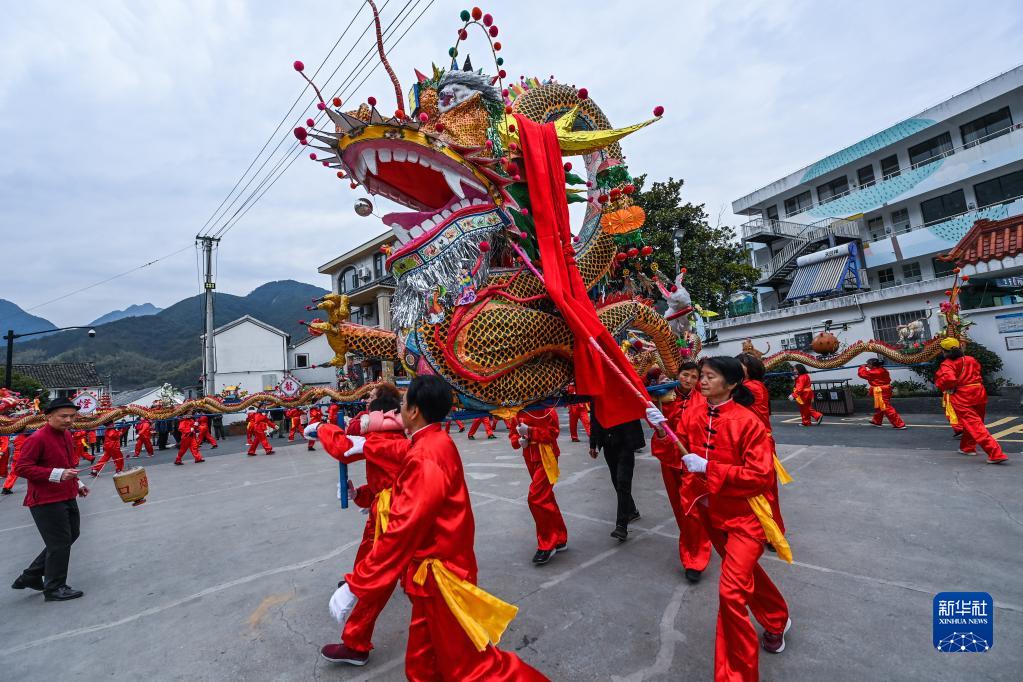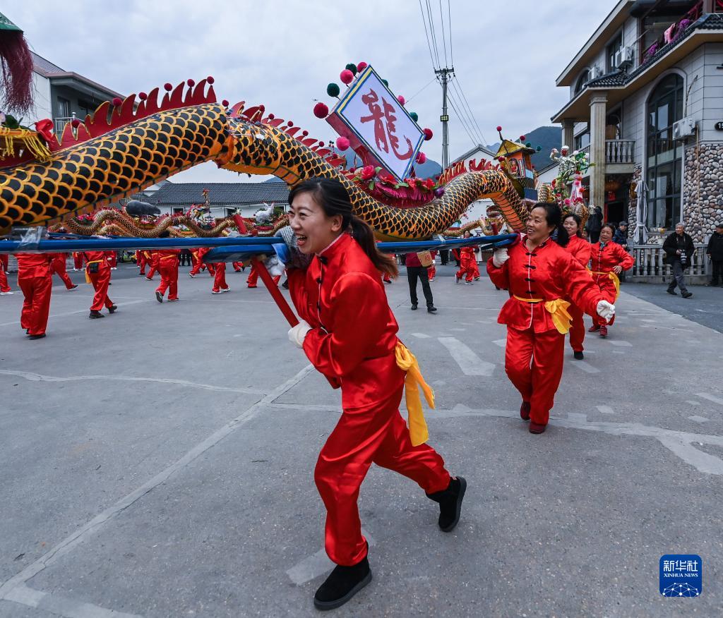 1日、湖源郷で板竜の舞いを披露する窈口村の女性。(杭州=新華社記者/徐昱)
