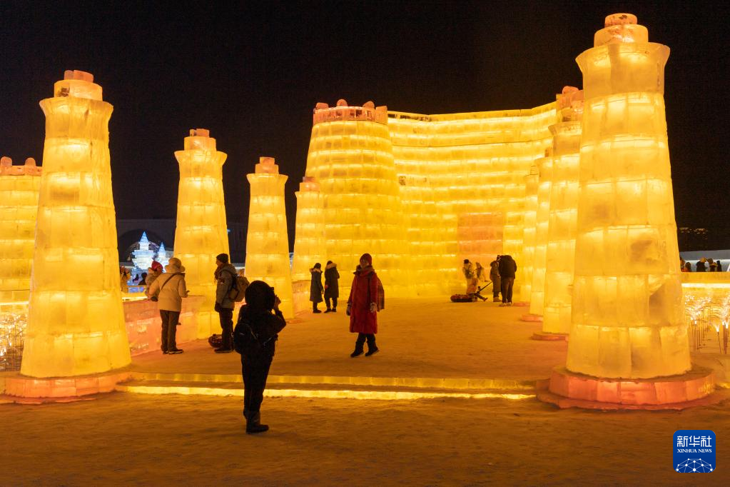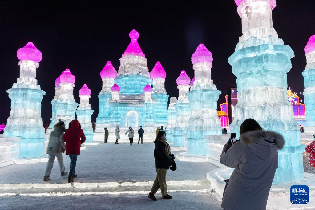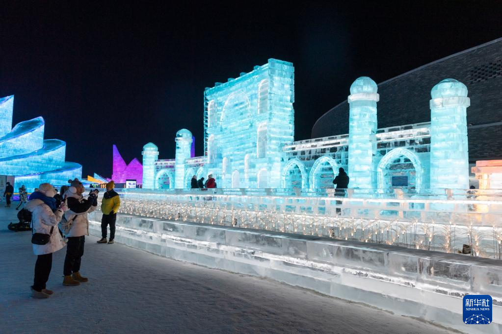 1日、ハルビン氷雪大世界の会場でタジキスタン・ホジェンドのソグド州立博物館をモデルにした氷像を見て回る観光客。(ハルビン=新華社記者/謝剣飛)
