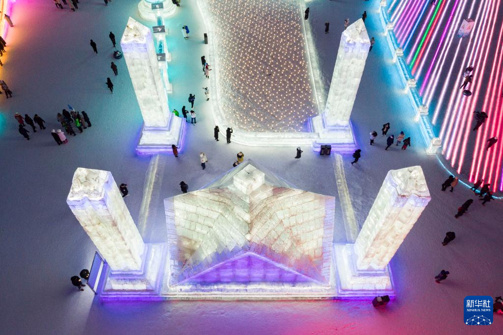 1日、ハルビン氷雪大世界の会場でカザフスタンのパンフィロフ戦士公園をモデルにした氷像を見て回る観光客。(小型無人機から、ハルビン=新華社記者/謝剣飛)pagebreak