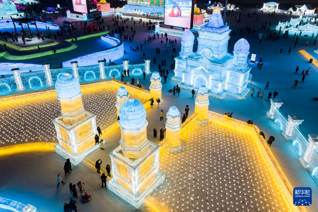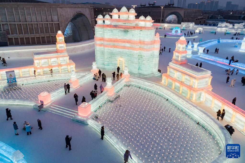 1日、ハルビン氷雪大世界の会場でインドのファテープル・シークリーをイメージした氷像を見て回る観光客。(小型無人機から、ハルビン=新華社記者/謝剣飛)