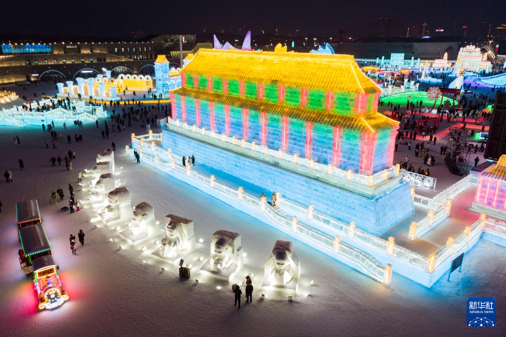 1日、ハルビン氷雪大世界の会場で中国・北京の太和殿をモデルにした氷像を見て回る観光客。(小型無人機から、ハルビン=新華社記者/謝剣飛)pagebreak
