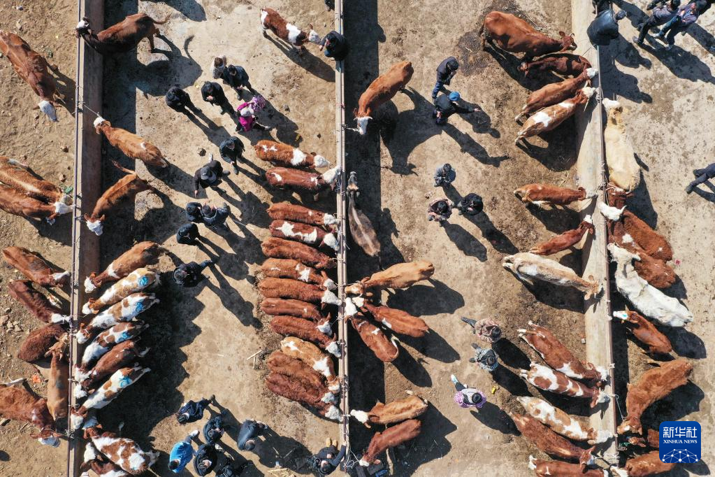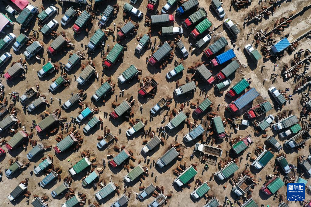11日、小海鎮の家畜取引市場。(小型無人機から、威寧=新華社記者/楊文斌)